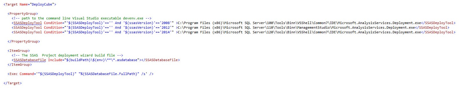 This post describes how to use MSBUILD to automate the build and deployment of a SSAS Analysis Services Cube. This solution relies on calling Visual Studio (devenv.exe) from within MSBUILD to first build the Cube and then using the SSAS deployment wizard from the command line to deploy the Cube.