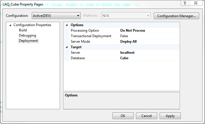 Processing Option. Set this to ‘Do Not Process’. Usually you don’t want the cube to be process after deployment. This doesn’t affect the ‘Process’ option in Visual Studio.