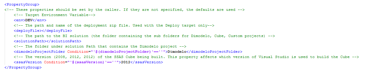 The first thing to do in the MSBUILD script is to define some properties. These properties can be passed on the command line when calling the MSBUILD script.
