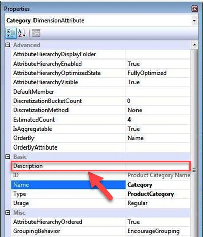 First, you need to add descriptions to the Measure Groups, Measures, Dimensions and Attributes in your Cube project. In your Visual Studio SSAS project, simply enter your descriptions into the description property of each dimension/”fact/”measure group” and measure/attribute you want to document: